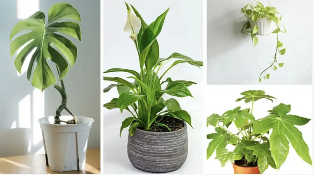 Deve tabanı, barış çiçeği, salon sarmaşığı (üstte) ve Hint yağı bitkisi (soldan sağa)