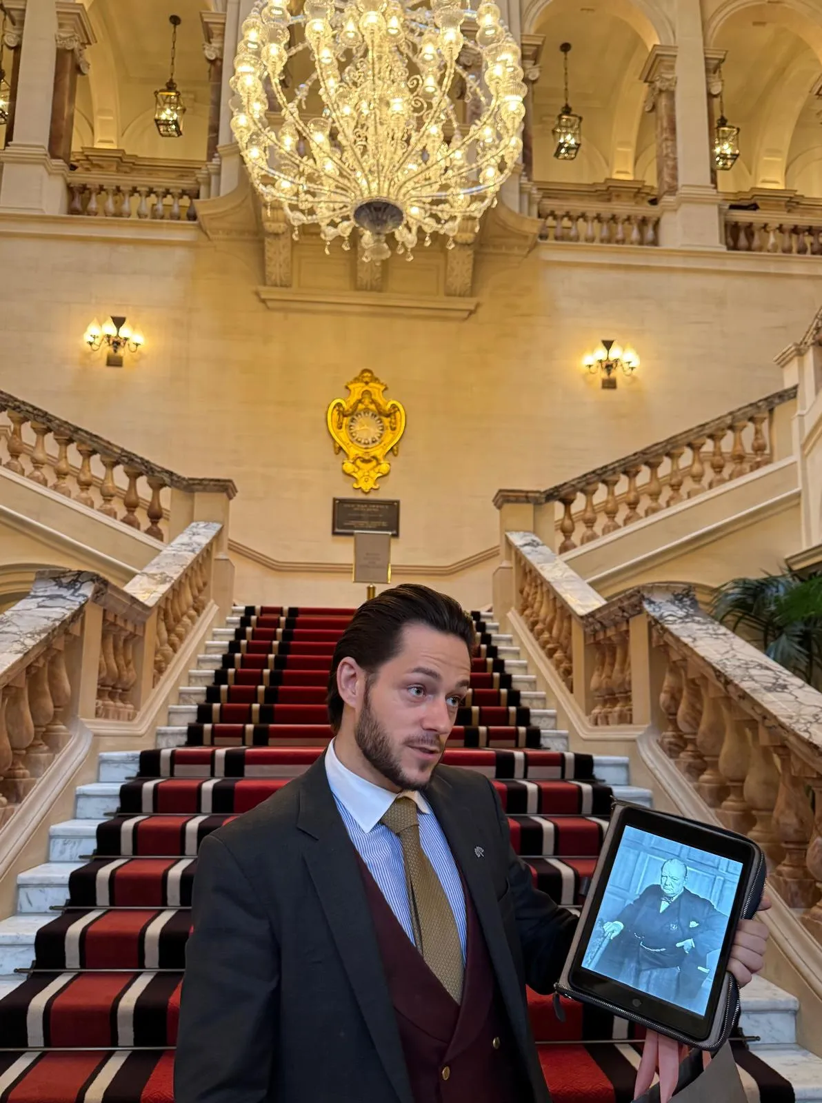 Bina hakkında bilgi veren rehber, elimde Churchill’in fotoğrafıyla