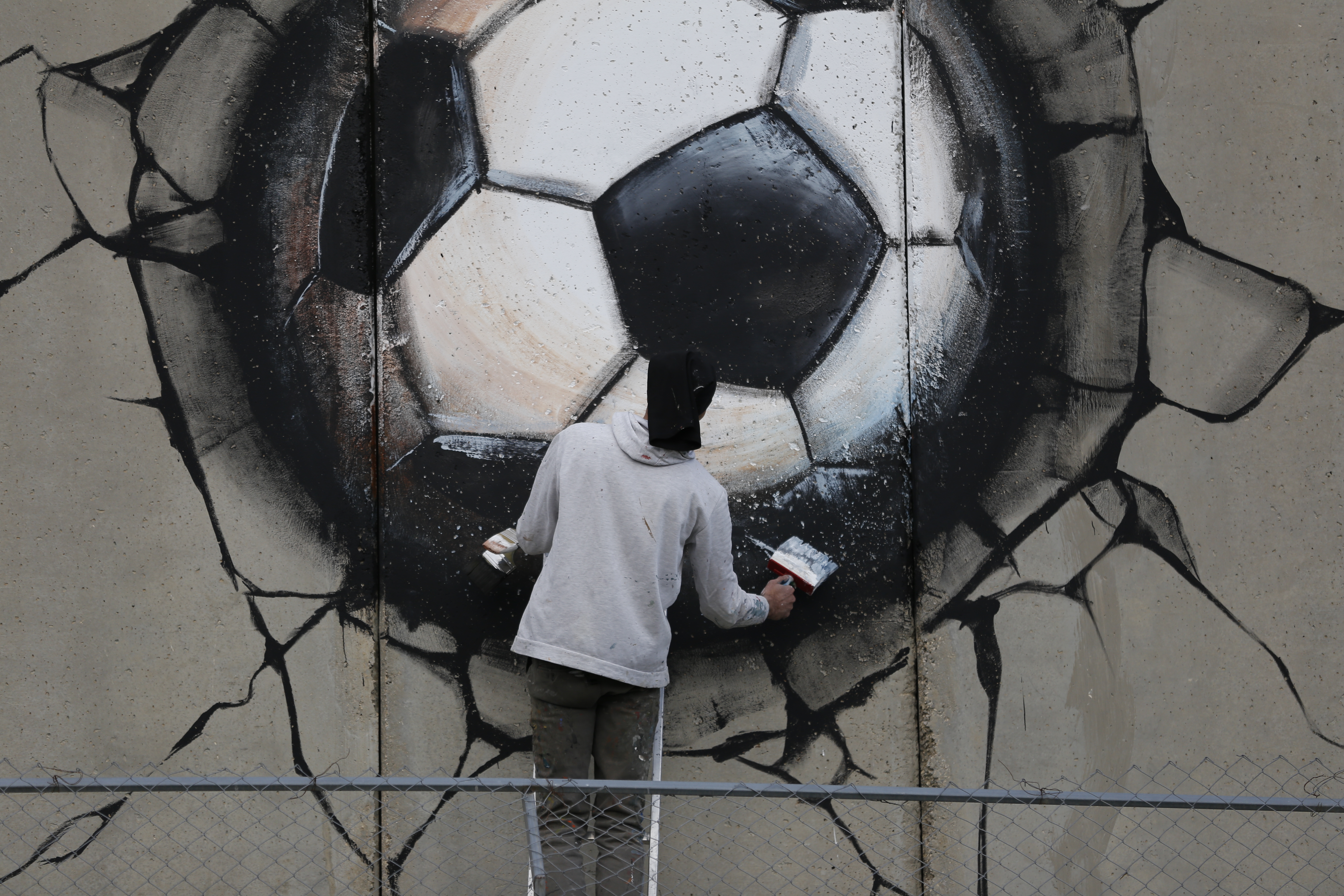 Sebatin, stadyumun batı cephesindeki Ayrım Duvarı’na, duvara çarpıp onu çatlatan bir futbol topu resmi çizerek çocukların iradesinin engelleri aşabileceği mesajını verdi.