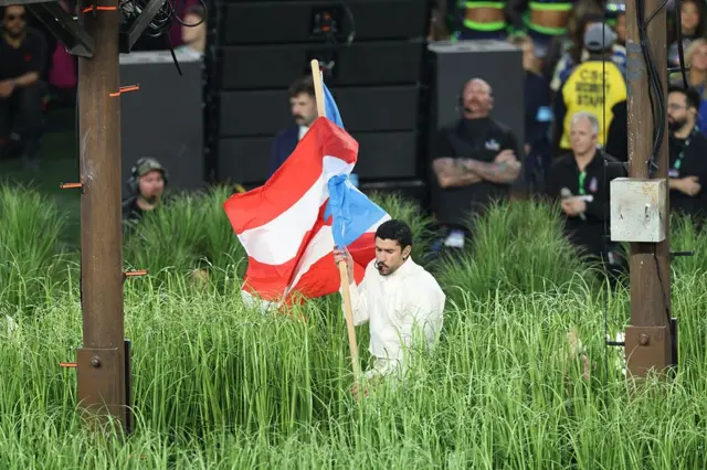 Bad Bunny gösterisinin sonunda “nefretten daha güçlü şey sevgidir” yazılı bir reklam panosu önünde, elinde İngilizce “birlikte biz amerikayız” sloganı yazılı bir futbol topu tutuyordu. Arkasındaki dansçılar ellerinde bayraklar taşıyorlardı.