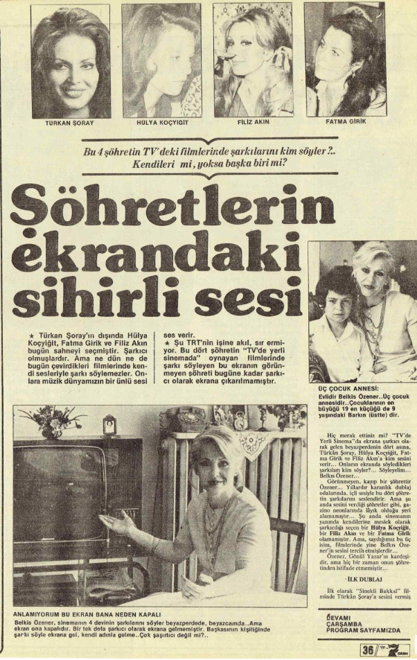 Gönül Yazar’ın kız kardeşi de olan -daha sonraki yıllarda onun gölgesinde kaldığını ve kendisine destek olmadığını söyleyecekti- Belkıs Özener, 1965 yılında Sokak Kızı filmiyle kendi tabiriyle ‘karanlık stüdyolara’ ilk adımını attı. Sonrası ise tam 300 filmlik devasa bir birikim… Türkan Şoray, Hülya Koçyiğit, Filiz Akın, Fatma Girik ve Müjde Ar gibi Yeşilçam’ın neredeyse bütün kadın yıldızlarının sesi oldu. Ancak bu ses, filmlerin jeneriklerinde kendine pek yer bulamadı.