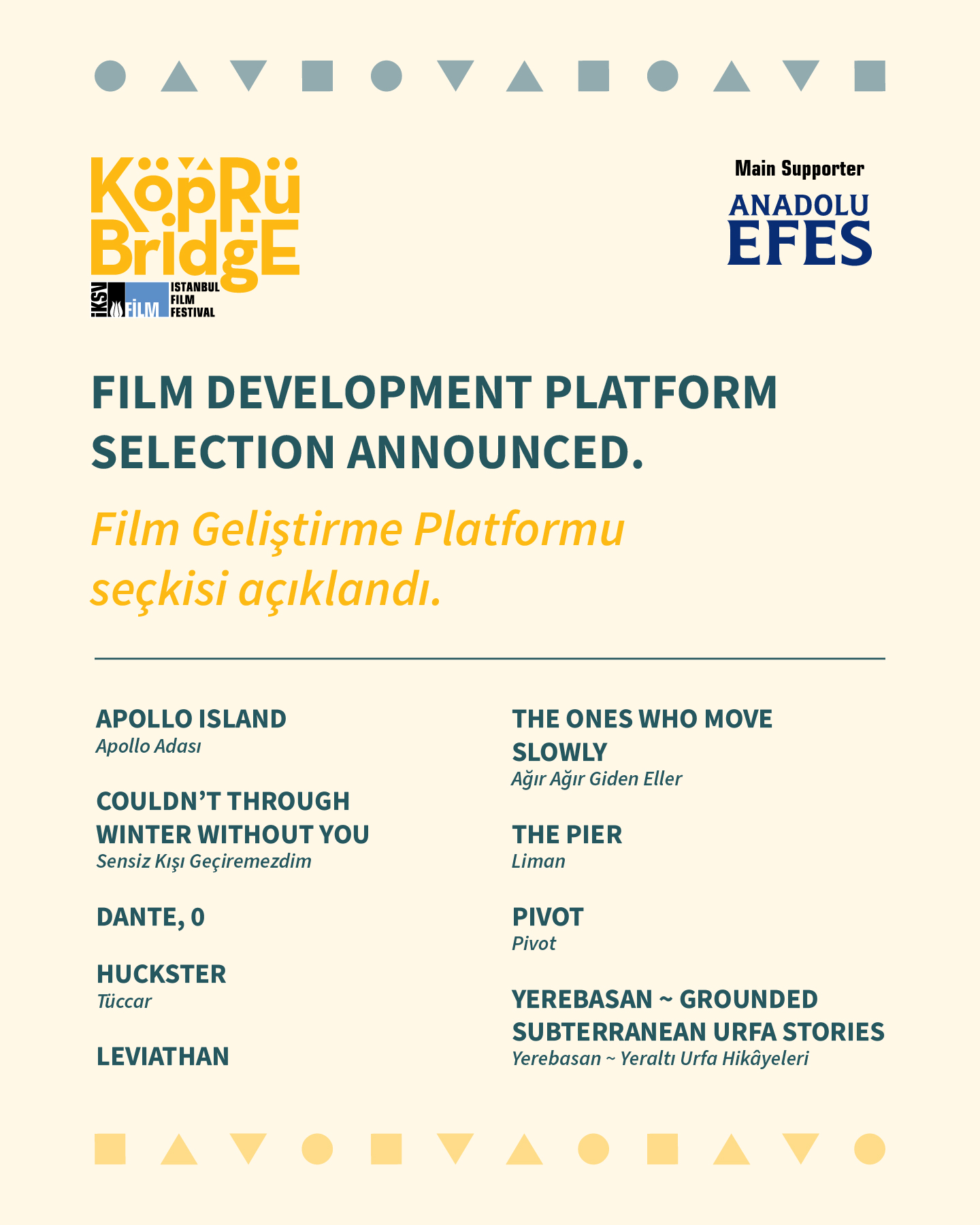 Anadolu Efes’in ana destekçisi olduğu 21. Köprüde Buluşmalar’ın Film Geliştirme Platformu bu yıl 14-15-16 Nisan tarihlerinde düzenlenecek.