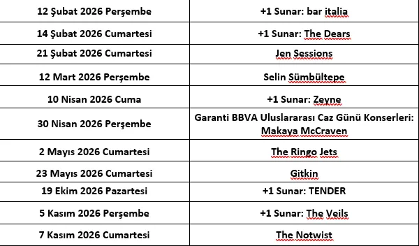 Salon’un 2026 takviminde; +1’in katkılarıyla, Londralı post-punk grubu bar italia, Kanada’nın kendine has indie rock ikonu The Dears, R&B’yi Arap ezgileriyle buluşturan Zeyne, İngiliz indie elektronik müzik ikilisi TENDER ve grotesk ve görkemli indie rock grubu The Veils yer alıyor. Geleneklerine bağlılığını füzyon folk-pop’la aktaran Selin Sümbültepe, Garanti BBVA Uluslararası Caz Günü Konserleri kapsamında mekâna ve ana özgü doğaçlama ritimleriyle Makaya McCraven, müdanasız bir rock & roll ziyafetiyle The Ringo Jets, çöl blues’unun hipnotik melodileriyle Gitkin ve Alman indie rock ve elektronik grubu The Notwist de bu sezon izleyicilerle buluşacak isimler arasında. Programa eklenecek yeni isimler, önümüzdeki dönemde duyurulacak.