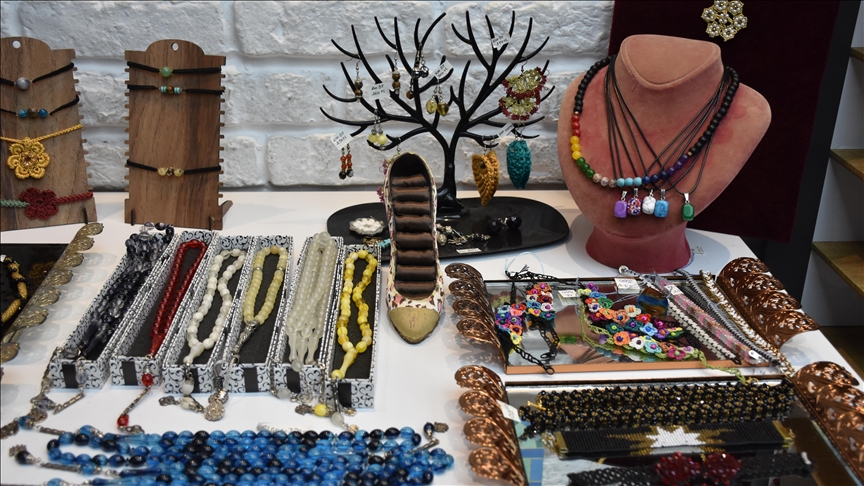 Boncuk kullanarak hazırladığı broşları satışa sunan Rukiye Can Ramoğlu da “Hem sosyalleştiriyoruz hem üretiyoruz, ürettiğimizi insanlarla paylaşabiliyoruz.” dedi.(AA)