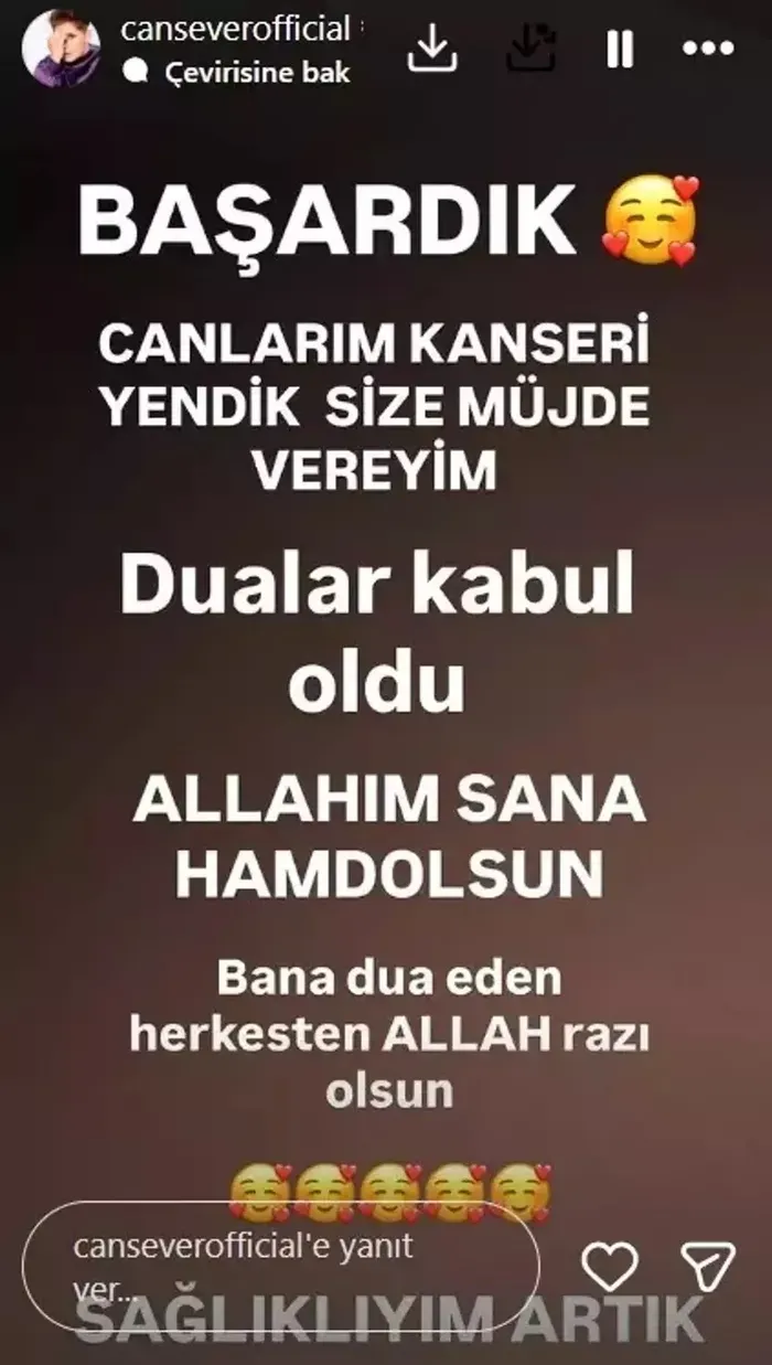 Hastalığı yendiğini Cansever, “Başardık canlarım… Kanseri yendik, size müjde vereyim. Dualar kabul oldu. Allah’ım sana hamdolsun. Bana dua eden herkesten Allah razı olsun. Sağlıklıyım artık” sözleriyle duyurdu.