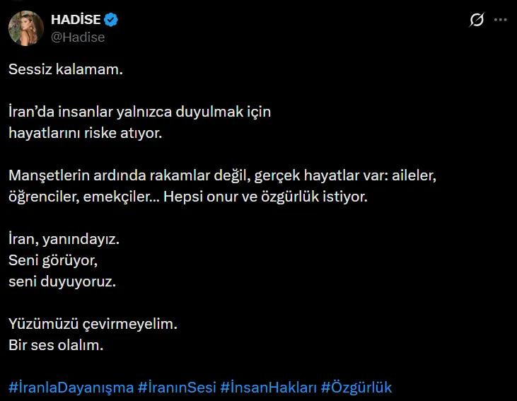 Şarkıcı Hadise İran’da yaşananlara dair sessiz kalmadı ve “Sessiz kalamam. İran’da insanlar yalnızca duyulmak için hayatlarını riske atıyor. Manşetlerin ardında rakamlar değil, gerçek hayatlar var: aileler, öğrenciler, emekçiler… Hepsi onur ve özgürlük istiyor. İran, yanındayız. Seni görüyor, seni duyuyoruz. Yüzümüzü çevirmeyelim” ifadelerini kullandığı bir paylaşım yaptı.