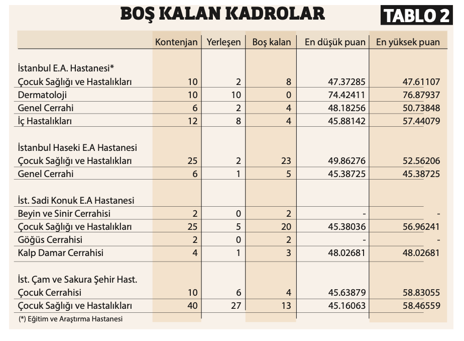 Hemen ardından ekliyor: “Bu tabloda göremediğimiz ise boş kalan kontenjanlar… Örneğin, çocuk hastalıkları, çocuk cerrahisi, beyin cerrahisi gibi branşlarda açılan kadrolar boş kalabiliyor. Tercih edilmiyor.”