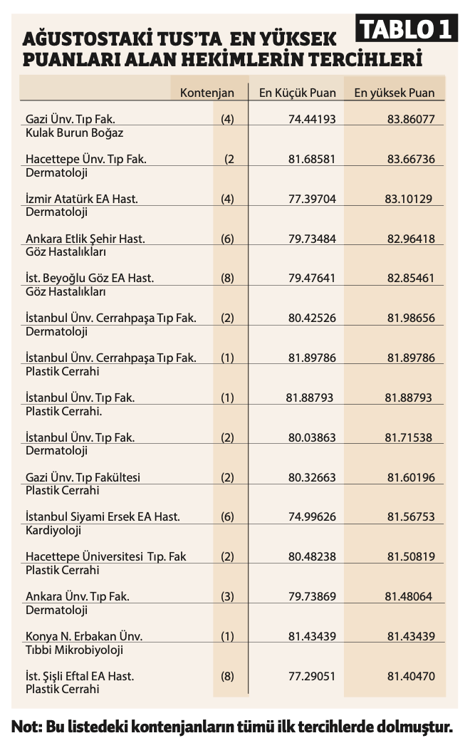 Muhakkak vurgulanması gereken bir nokta, İstanbul Üniversitesi Cerrahpaşa ve İstanbul (Çapa) Tıp Fakülteleri, Ankara’da Hacettepe, Ankara Üniversitesi ve Gazi Üniversitesi Tıp Fakülteleri, İzmir’de Ege Üniversitesi Tıp Fakültesi gibi köklü okulların pek çok branşta genellikle yüksek puanlı öğrencileri çekmeye devam etmeleridir. Bu alandaki bütün tartışmalara karşın, söz konusu kurumların akademik gelenekleri ile genç hekimler açısından güçlü bir çekim alanı olmayı sürdürdükleri görülüyor.