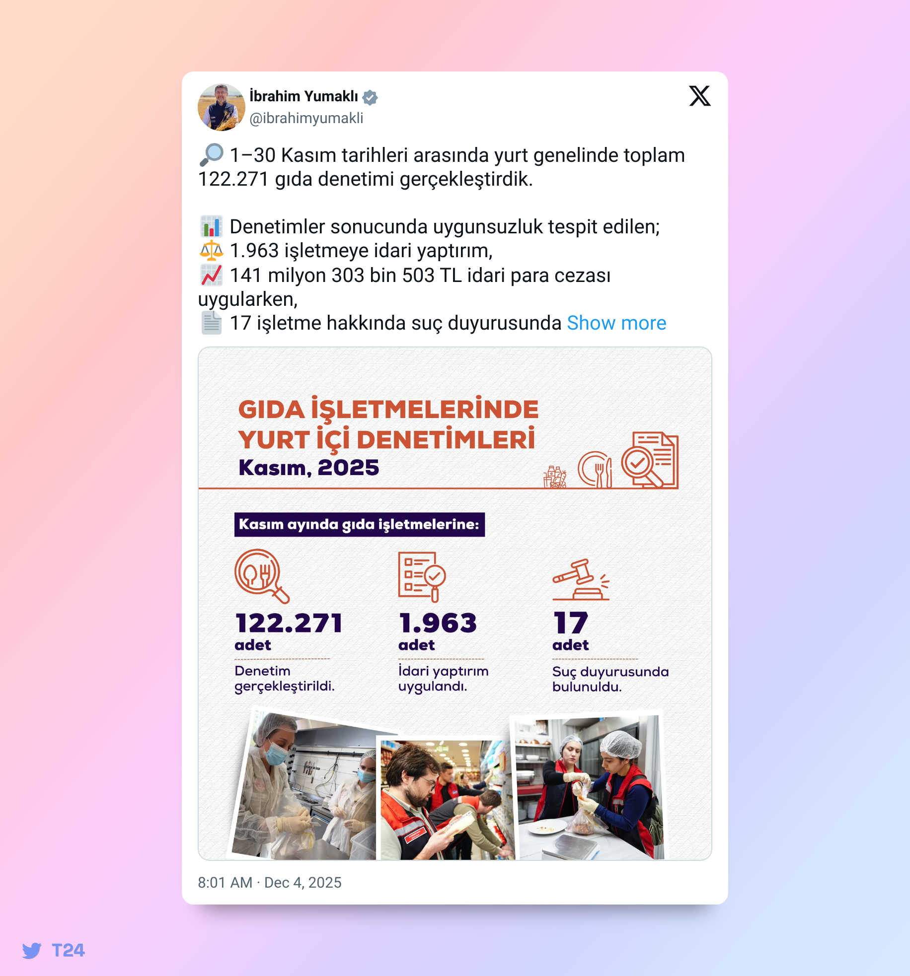 Tarım ve Orman Bakanı İbrahim Yumaklı, 1 – 30 Kasım tarihleri arasında yurt genelinde 122 bin 271 gıda denetimi gerçekleştirildiğini, uygunsuzluk tespit edilen bin 963 işletmeye toplam 141 milyon 303 bin 503 TL idari para cezası uygulandığını ve 17 işletme hakkında suç duyurusunda bulunulduğunu açıkladı.